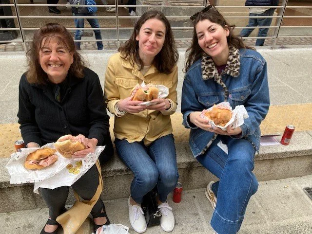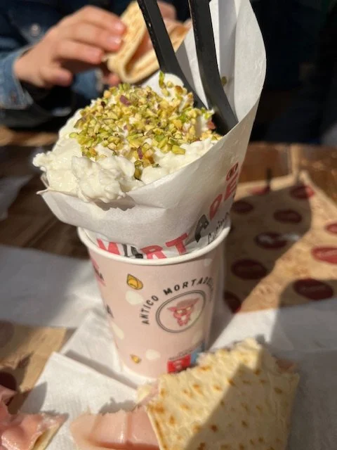 One of the first meals we set out to try once we arrived in Bologna was a sandwich from Mo Mortadella Lab. It is a take out (or as they say in Italy, a take away) street food shop in town that only serves mortadella sandwiches. You can order mortadella with stracciatella, burrata, parmigiano, eggplant, broccoli rabe, squacquerone, zucchini, and endless other additions. The bread is homemade and warm, and the most expensive sandwich is 7.5E. Holy cold cuts… this is ecstasy. People line up to buy one, and then take their culinary treasure to the nearest building wall and eat it standing up, or while sitting on a curb. Street food is a thing here in Bologna, and everyone walks or stands in the street while eating some sort of sandwich or arancina or gelato while on the move. And everyone is thin.