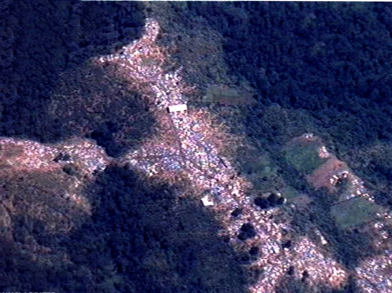 Aerial photograph of a Mihanda, Zaire refugee camp in 1996. Pictured are 500+ tents set up in the Mitumba Mountains.